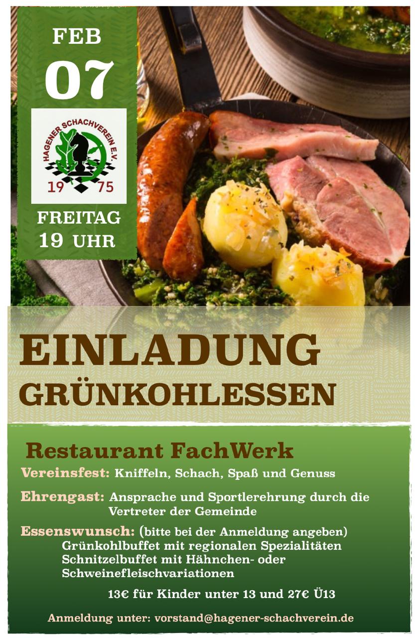 Liebe Schachfreunde, traditionsgemäß laden wir Euch herzlich zu unserem jährlichen Grünkohlessen ein, das eine perfekte Gelegenheit bietet, gemeinsam Zeit im Kreise unseres Schachvereins zu verbringen. Datum: 07. Februar Uhrzeit: 19:00 Uhr Ort: Restaurant Fachwerk in Hagen Wie immer erwartet Euch ein geselliger Abend mit Spaß, Schach und Kniffeln. Bitte bei der Anmeldung den Essenswunsch angeben unter vorstand@hagener-schachverein.de. Ihr habt…